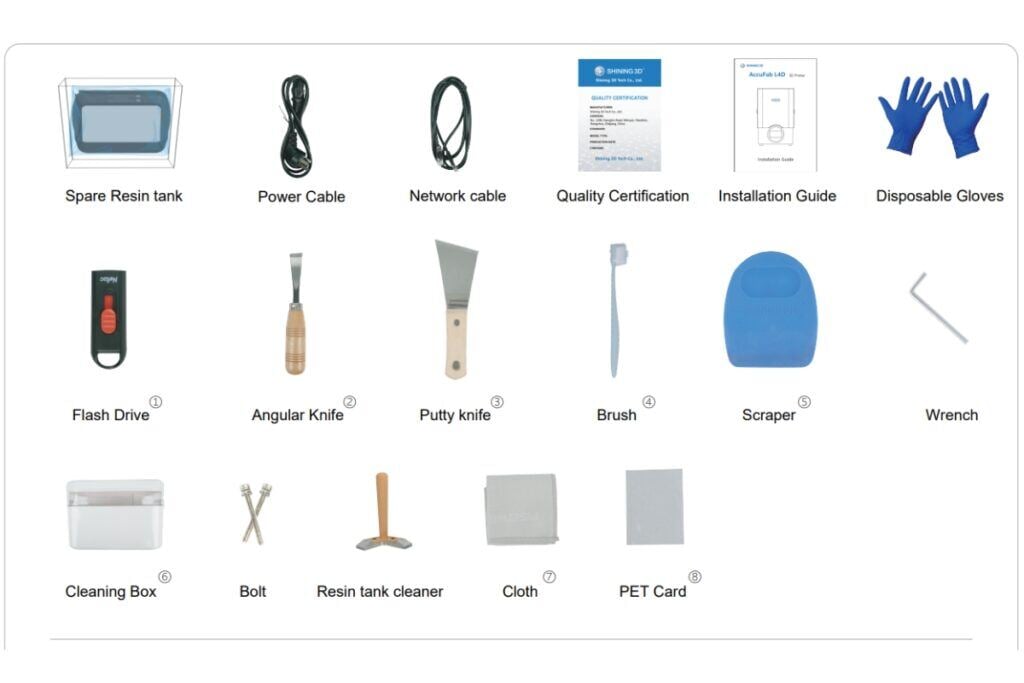 - Accesorii si indicatii multiple. Pe langa tehnologia avansata pe care o ofera, imprimanta AccuFab L-4D Shining 3D vine impreuna cu o serie de accesorii.
